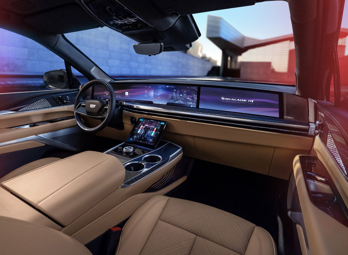 The Escalade IQ’s interior is modern and sleek, and it has enough room for up to eight people. It has a curved 55-inch diagonal tablet display that goes across the whole dashboard and houses the climate controls, audio and video controls, and instrument panel. You can change the display to show different modes and information, like guidance, entertainment, performance, or background lights. In the Escalade IQ, there is also a luxury second row with two seats that can massage, heat, cool, or recline, as well as a center bench with cup holders and wireless charging.
